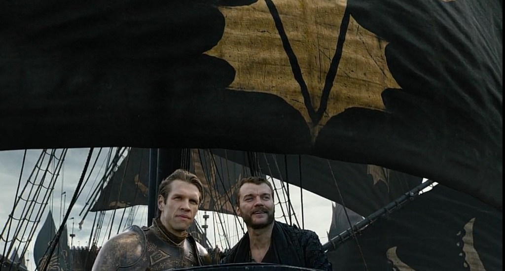 Dopo vari accenni durante la serie vediamo l’arrivo a Westeros con le navi di Euron Gryjoy della Compagnia Dorata e del comandante Harry Strickland. Qui già si vedono le prime differenze evidenti con i romanzi, dove il comandante viene descritto: “Harry non ha molto l’aspetto del guerriero: è corpulento, con una testa grossa e tonda, miti occhi grigi, capelli sempre più radi riportati da una parte per nascondere un principio di calvizie. Gli piacciono gli elefanti “. Nella serie invece vediamo un belloccio comandante Strickland che non ha niente che a vedere con la descrizione dei romanzi. Poi niente elefanti! Anche Cersei non e stata contenta.