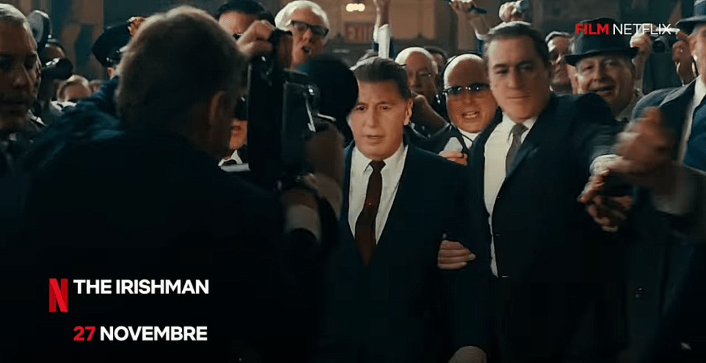 Robert De Niro, Al Pacino e Joe Pesci sono i protagonisti di THE IRISHMAN di Martin Scorsese, una saga epica sulla criminalità organizzata nell’America del dopoguerra vista dagli occhi del reduce della Seconda guerra mondiale Frank Sheeran, imbroglione e sicario che ha lavorato al fianco di alcune delle figure più tristemente note del ‘900. Il film copre diversi decenni di uno dei maggiori misteri irrisolti della storia americana, la scomparsa del leggendario sindacalista Jimmy Hoffa, offrendo un viaggio grandioso attraverso i segreti del crimine organizzato, tra i suoi meccanismi interni, le rivalità e i legami con la politica.