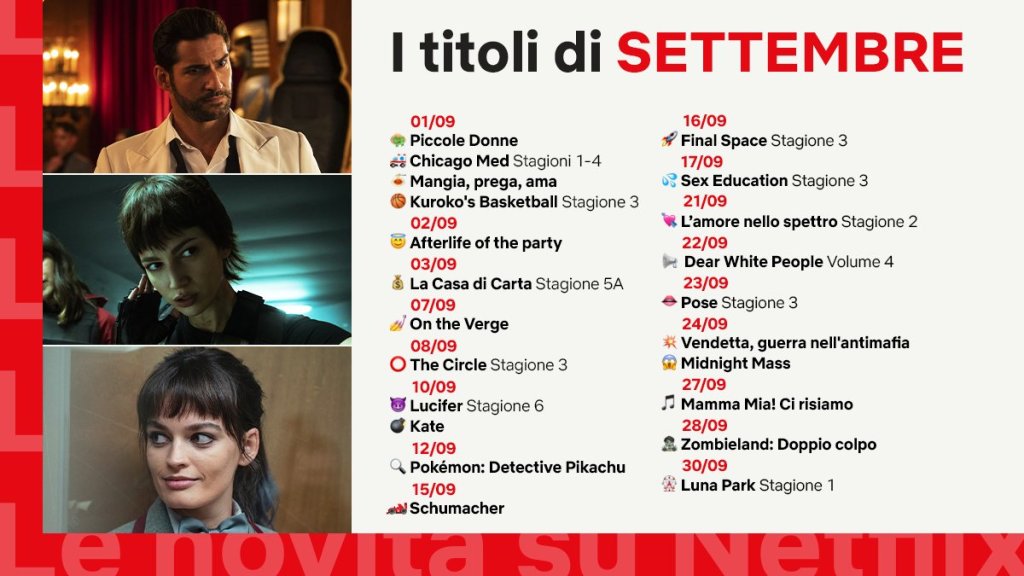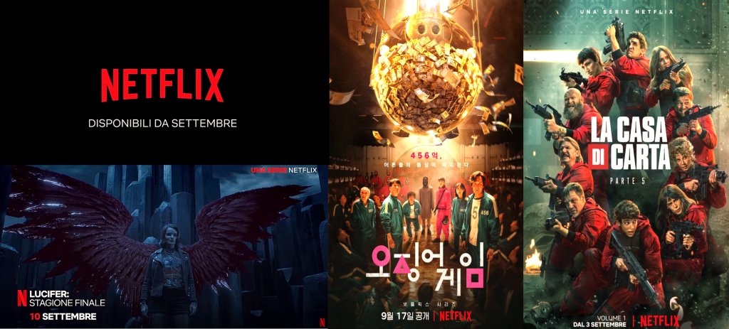 Da non perdere Lucifer 6, La casa di Carta 5 e Kate. Tra gli anime Kuroko’s Baske 3 e Baki 3 mentre tra i K-Drama segnaliamo Squid Game